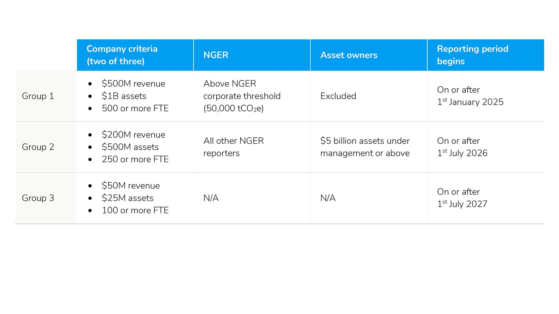 Under the Corporations Act 2001, Australian entities are required to submit climate-related disclosures if they meet the criteria in Table 1. The reporting will be phased in over three years, starting from January 1st 2025 for Group 1 companies, 1st July 2026 for Group 2, and 1st July 2027 for Group 3 (see Table 1).